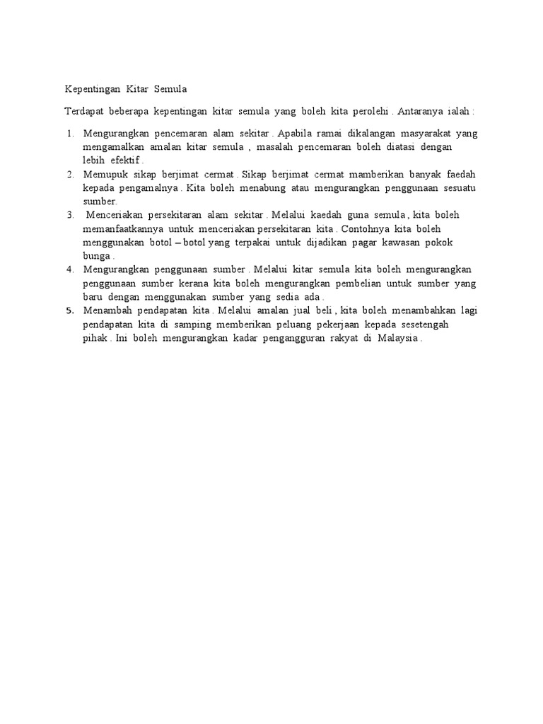 Laporan pertandingan kitar semula (contoh). Namun persoalannya, sejauh manakah amalan kitar semula ini dipraktikkan oleh masyarakat kita pada hari ini? Kitar semula merupakan salah satu cara car a terbaik untuk kita bagi mendapatkan kesan yang positif kepada dunia yang sedang didiami ini. Izharnya, amalan kitar semula dapat membantu manusia untuk menjimatkan sebahagian sumber kewangan yang digunakan untuk mengurus bahan buangan dan disalurkan ke arah yang lebih bermanfaat. Menjadikan masalah sisa buangan khususnya sisa domestik dapat diatasi. Kepentingan amalan kitar semula geografi pt3 tingkatan 3 chp isu dan pengurusan alam sekitar. Amalan kitar semula di taman seri serdang, selangor. Muhammad ihsan adfinda tingkatan nama guru : Botol minuman ringan, botol jus, botol minuman air mineral, bekas makanan, bekas sabun cecair mandian, botol syampu, botol makanan. Kitar semula bahan bergantung pada kemampuannya untuk mendapatkan semula sifat yang ada pada keadaan asli atau asal. Definisi menurut akta pengurusan sisa pepejal dan pembersihan awam 2007 ( akta 672) kepentingan terhadap alam sekitar kitar semula adalah amat penting kerana sisa buangan memberikan kesan negatif yang amat besar. Terdapat kajian yang telah dijalankan dengan fokus kepada isi rumah di shah alam 3 yang menurut sebuah kajian 4, peratusan rakyat malaysia yang sedar akan kepentingan kitar semula adalah 99%. Kitar semula adalah proses menukar bahan buangan menjadi bahan dan objek baru.