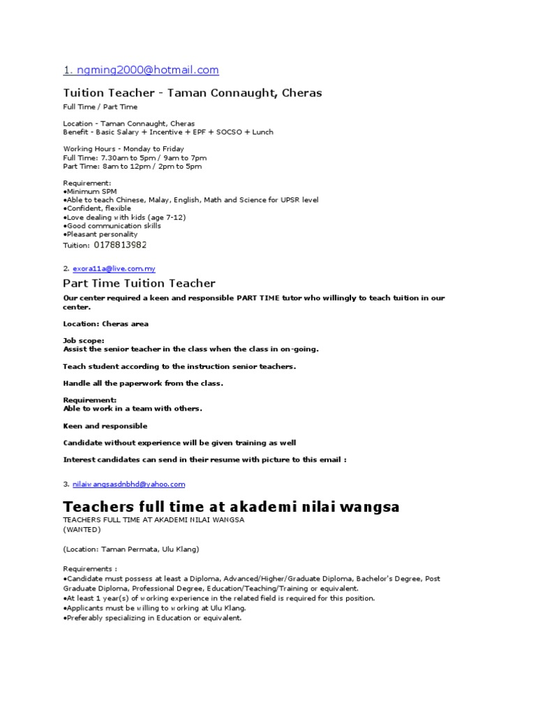 Part Time Job In Cheras : By connecting the employers and jobseekers through our online services, we make flexible employment more accessible.. Rent room in cheras part time job in cheras used car in cheras services in cheras items for sale in cheras. Do you enjoy working with people and problem solving? Website listing part time teacher jobs in china: We are looking for experienced and dedicated english language teachers. * working two days per week, 10 hours per…