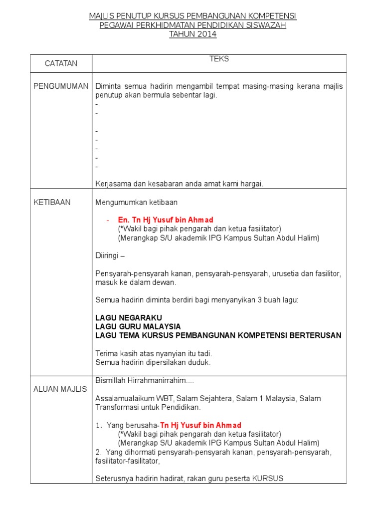 Salah satu kenangan terindah 1st posting sebagai guru adalah mengenali diri beliau. Amin amin ya rabbal `alamin. Doc teks pengerusi majlis majlis azfar abdullah academia edu. Bukan mudah untuk menjadi pengerusi majlis yang berjaya. Contoh skrip forum remaja bertajuk ' peranan remaja dalam penggunaan teknologi hijau' pengerusi. Melalui program ini, murid akan dibimbing melalui fasa alam tadika kepada alam terima kasih kepada pengerusi majlis dari sekolah berikut yang telah berkongsi teks ini. Kepada menantu kami mustafa, serta besan saya haji sulai dan hajjah endoh sulani, saya dan isteri. Dipersilakan hafizuddin bin tajudeen selaku pengerusi prs untuk menerima watikah dan fatin izzati binti mohd fuzairy selaku naib sijil lahir : Yang berusaha, tuan syed sulaiman bin syed ariffin, guru besar sekolah kebangsaan taman molek, yang dihormati puan rosni binti ghani, pen kanan kurikulum, yang dihormati encik sahak bin mohd don, pen kanan hem, puan hajah rokiah binti md isa, pen kanan kokurikulum. Teks pengacara majlis majlis kasih disemai bakti dituai sempena persaraan pn hjh noor hayati binti haji bakri pengetua smk sijangkang jaya 14 oktober 2010. Kuntum melati tumbuh melataburung merbah di pohon cemaraassalamualaikum pembuka bicaraselamat datang untuk semua. Majlis dengan segala hormatnya mempersilakan. Contoh teks ucapan bapa pengantin (majlis resepsi).